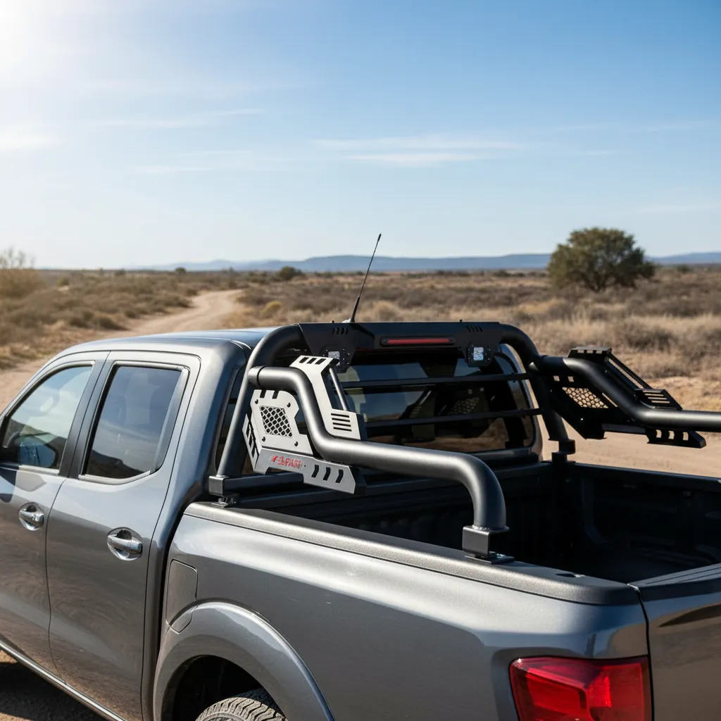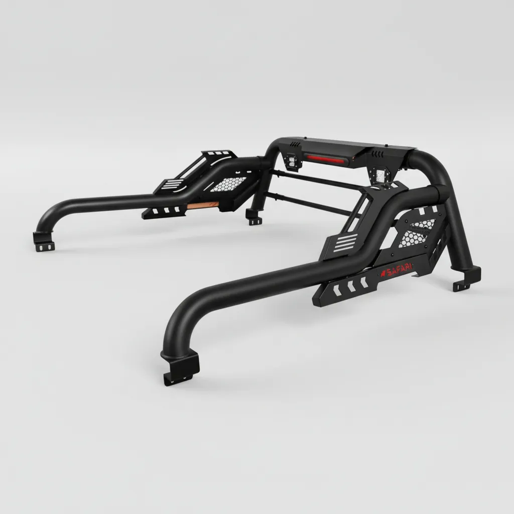 La barra antivuelco S8 con luz de freno y trabajo para Frontier NP300 de tercera generación años 2016 en adelante es la solución ideal para quienes buscan seguridad y estilo en su vehículo. Con un diseño ovalado que combina funcionalidad y estética, esta barra de la marca Safari se adapta perfectamente a tu camioneta, brindando una protección adicional en caso de vuelcos.
