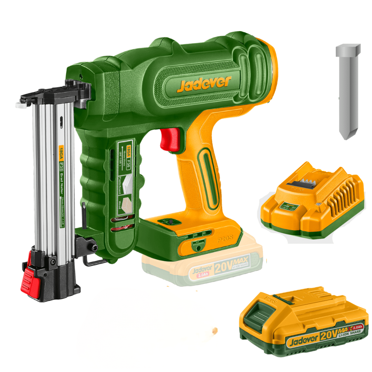 Accesorios 1000 clavos (35 mm) – 1 llave hexagonal – 1 batería de 20 V 2, 0 Ah (JDLBP520) – 1 cargador (JDFCP502)