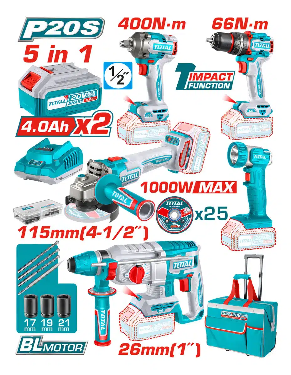 | Accesorio | 3Dados – 3Brocas – Cincel – 25Disco de corte – 47accesorios – 2Baterías (4.0 Ah) – Cargador |