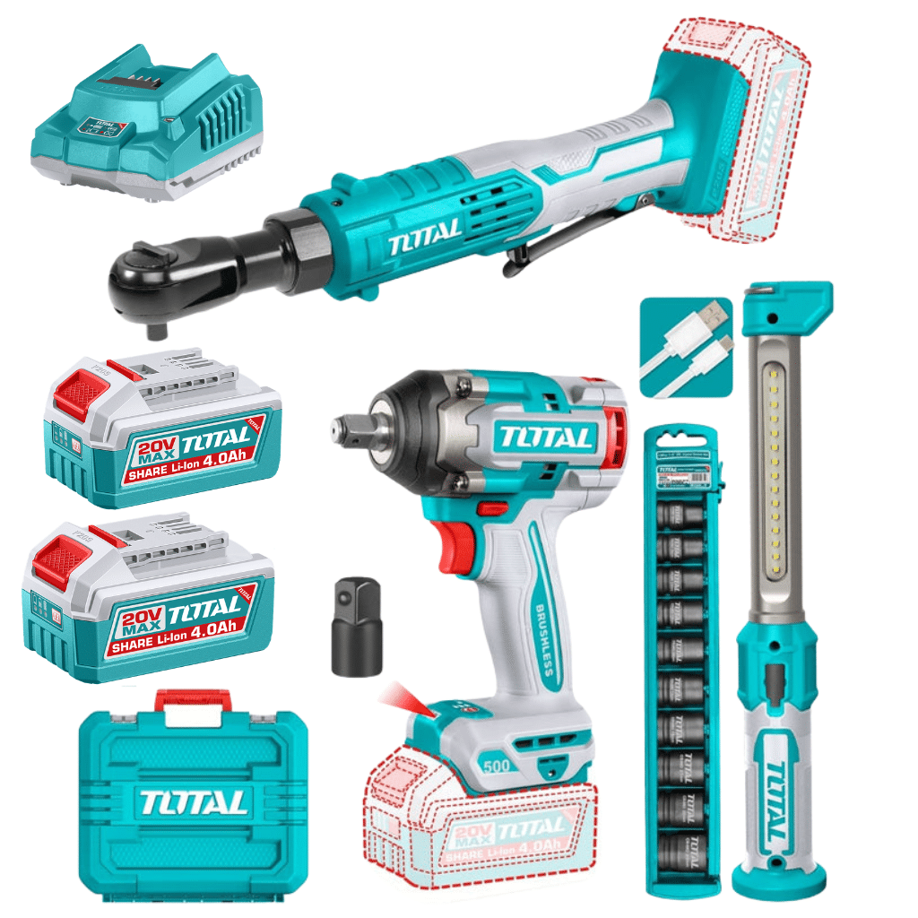 Combo del mes Total 20V Llave de Impacto Inalámbrica 500Nm , Ratchet de Conducción Inalámbrico 65Nm y Lampára de Trabajo 3.5W