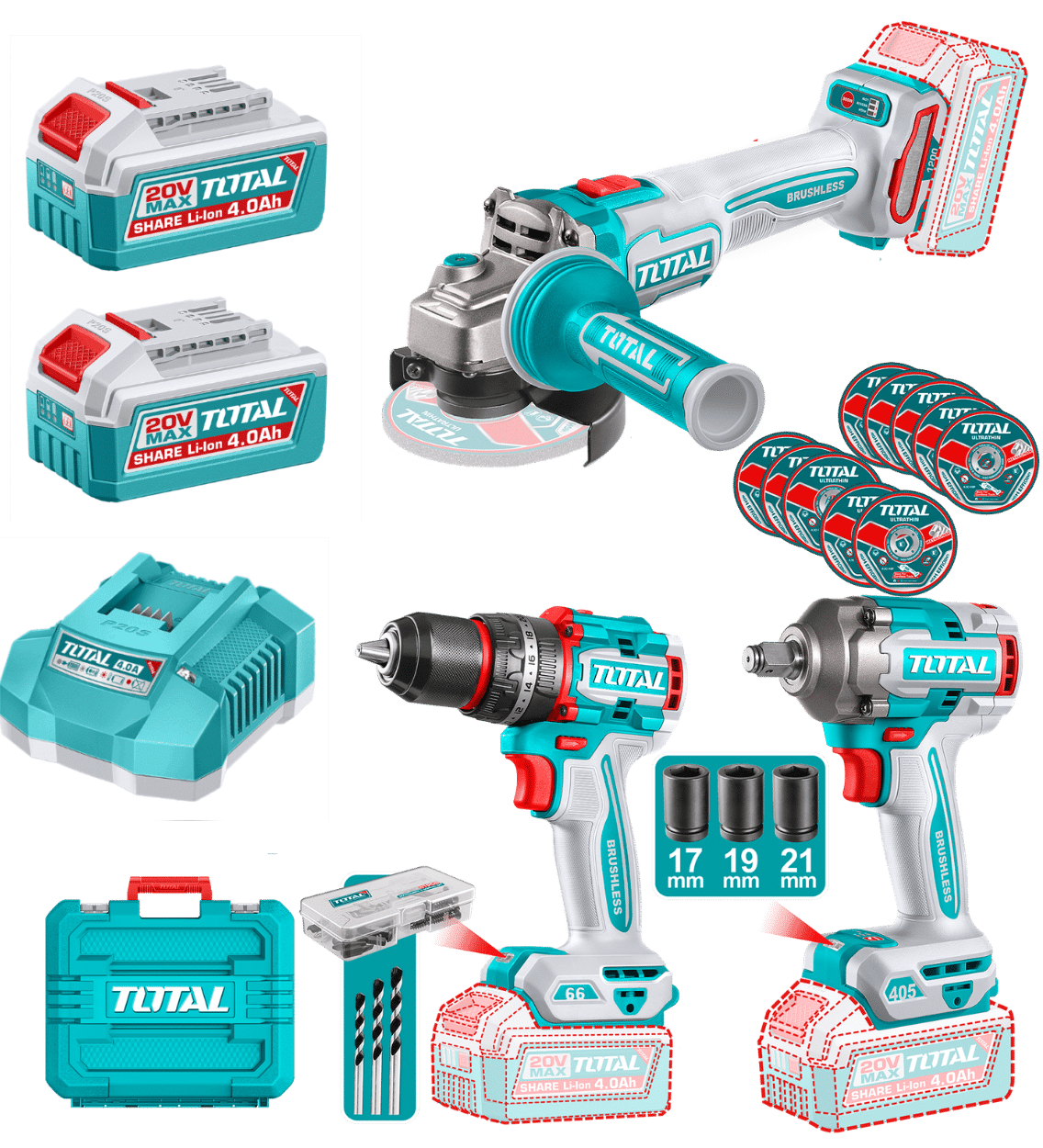 | Accesorios | Juego de discos abrasivos para corte de metal (10 piezas) – Accesorios (47 piezas) – Brocas para mampostería (3 piezas) – Llaves de vaso (17, 19, 21 mm) (3 piezas) – Paquetes de baterías de 4.0Ah (2 unidades) (TFBLI20021) – Cargador (1 unidad) (TFCLI20411) |