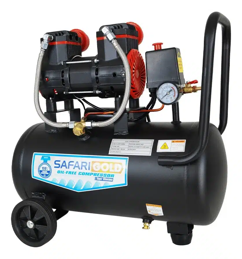 La Compresora Oil-Free Heavy Duty MY980W de Safari es la herramienta ideal para quienes buscan potencia y eficiencia en un diseño portátil. Con una capacidad de 24 litros y un caudal de aire de 165 l/min, este compresor es perfecto para trabajos que requieren un suministro constante de aire comprimido.