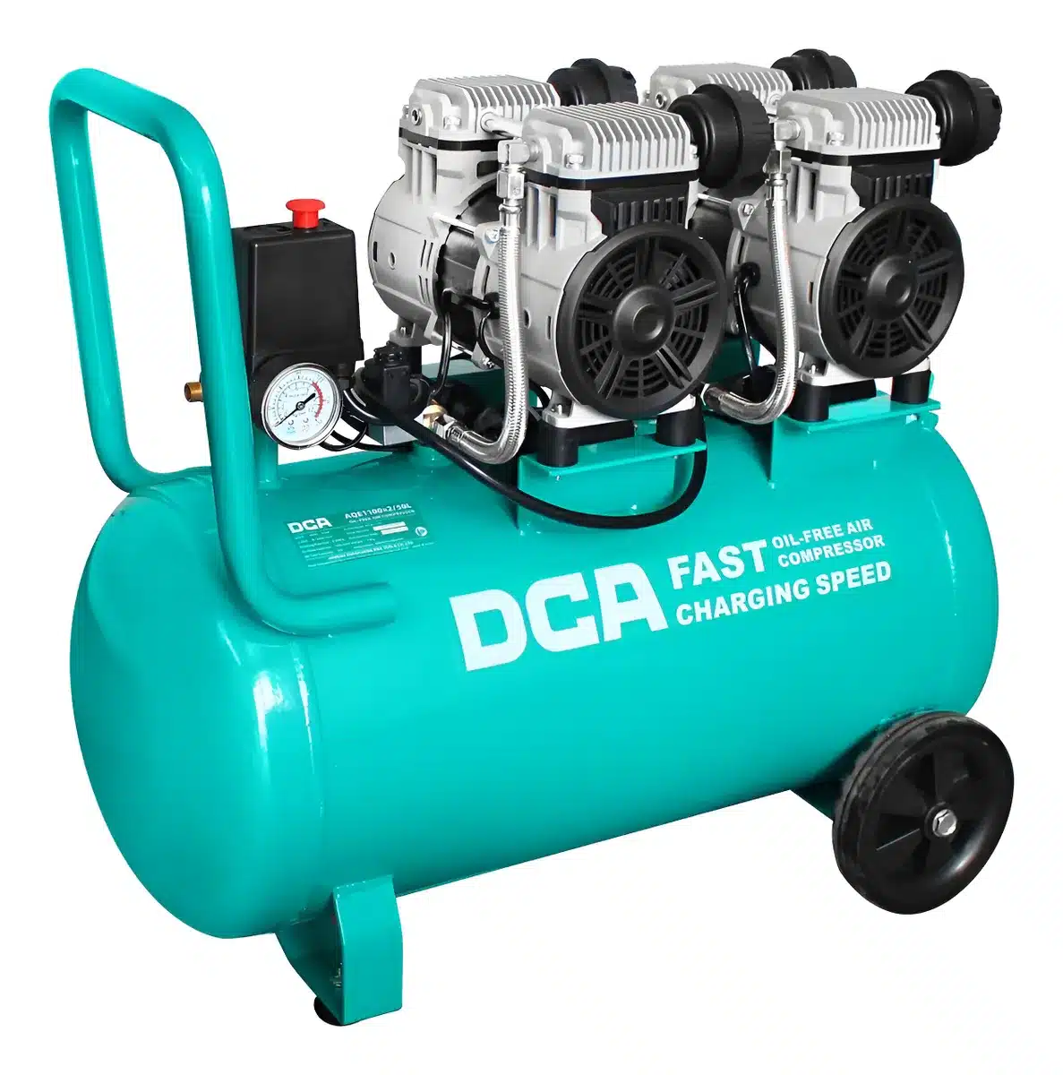 La Compresora Oil-free DCA AQE1100×2/50L es la solución ideal para quienes buscan un rendimiento eficiente y confiable en sus proyectos. Con una potencia de 1.475 hp y un caudal de aire de 140 l/min, este equipo es perfecto para tareas que requieren un suministro constante de aire comprimido. Su capacidad de 50 litros permite un uso prolongado sin necesidad de recargas frecuentes, lo que optimiza el tiempo de trabajo.