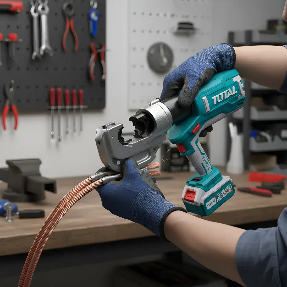 La Crimpeadora Li-ion 20v 16-400mm2 120kN 6-18s 2x5.0Ah de la marca Total es la herramienta ideal para profesionales que buscan eficiencia y precisión en sus trabajos. Su diseño inalámbrico permite una mayor libertad de movimiento, facilitando el acceso a espacios reducidos y mejorando la experiencia de uso.