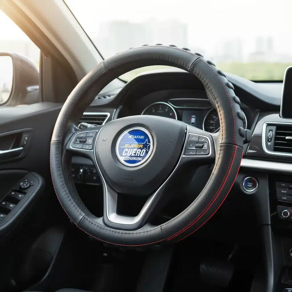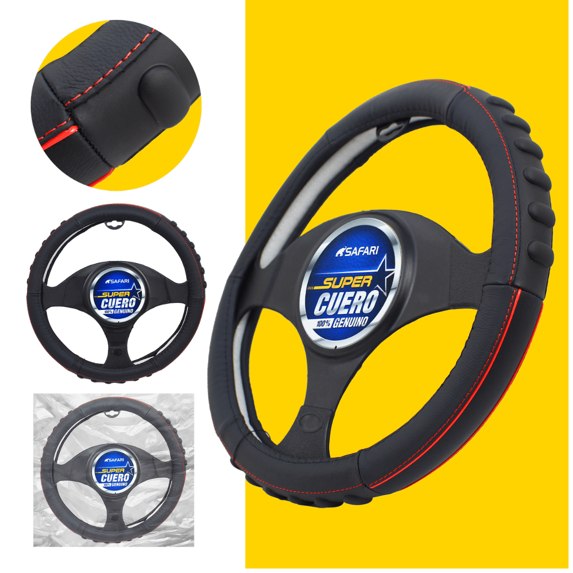 Transforma la experiencia de conducción con el CUBRE VOLANTE CUERO GEN NEGRO DETALLES ROJOS - SFW2201BK/RD de la marca Safari. Este accesorio no solo ofrece una estética elegante y moderna, sino que también proporciona un agarre cómodo y seguro, ideal para quienes buscan mejorar su control al volante.