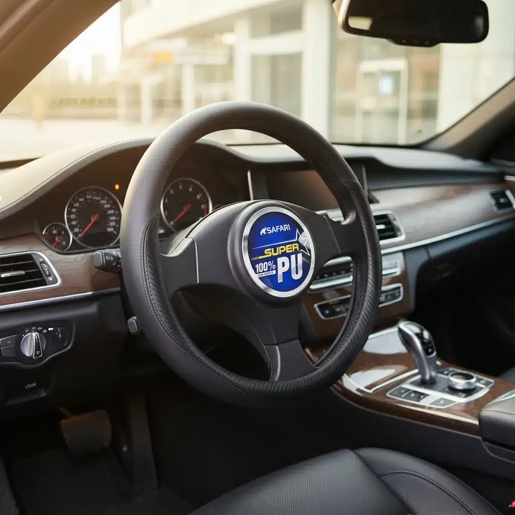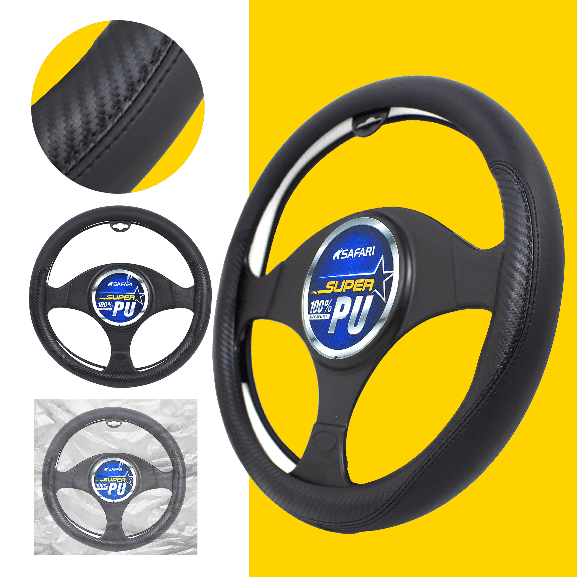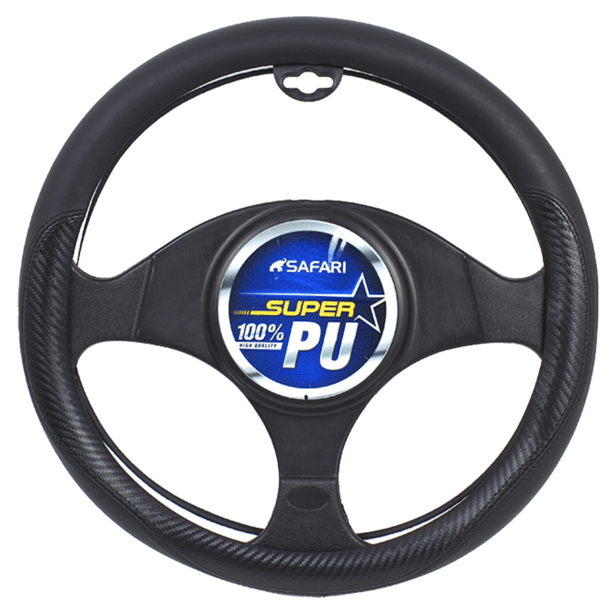 Protege y renueva el volante de tu auto con esta funda Safari de diseño moderno en color negro y detalles tipo fibra de carbono. Fabricada en material PU de alta calidad, ofrece un agarre cómodo y seguro para una mejor experiencia de manejo.