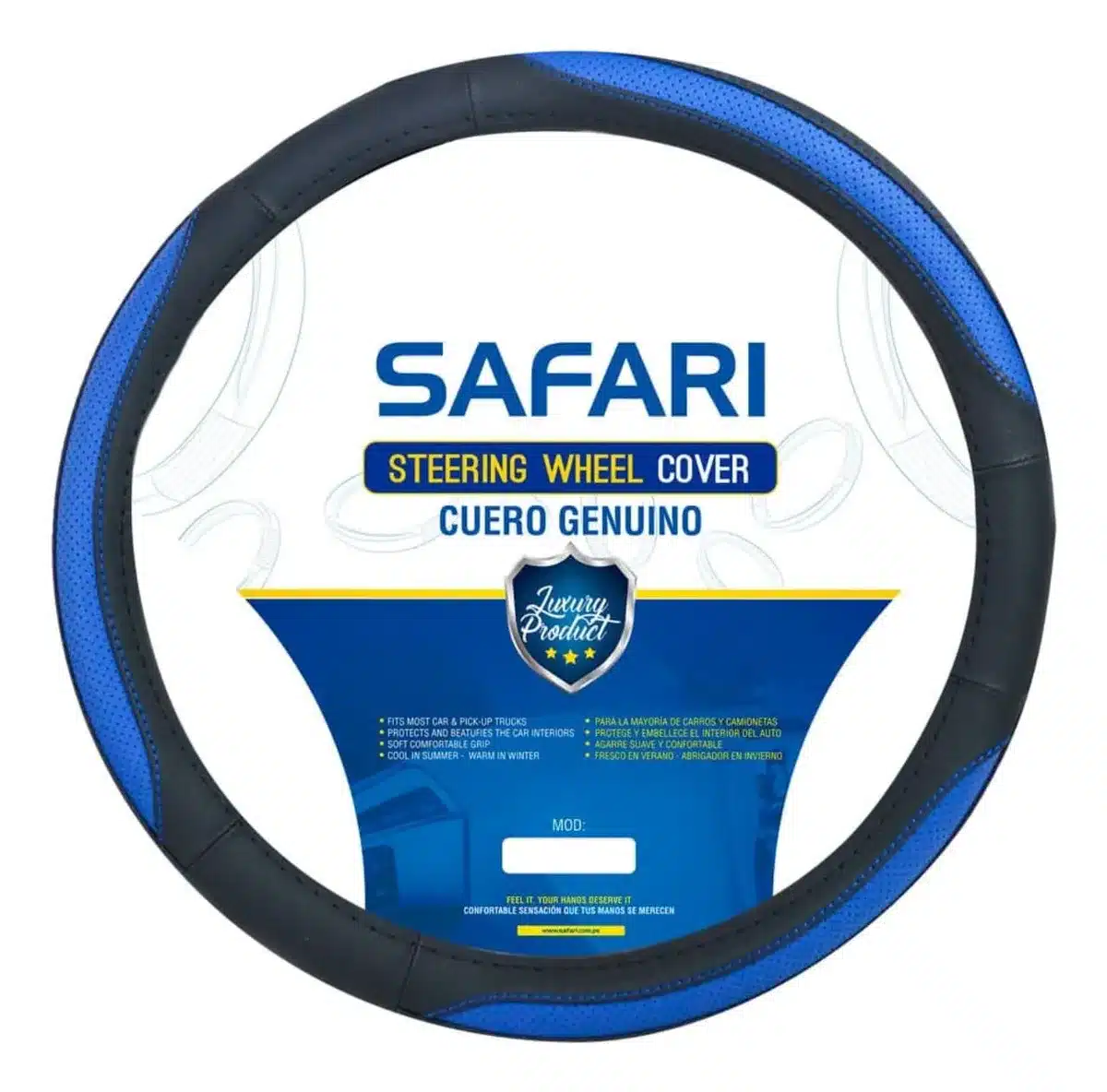 Transforma la experiencia de conducción con el Cubre Volante Cuero Negro 3p Dark Blue Especial de Safari. Diseñado para autos y camionetas, este cubre volante combina elegancia y funcionalidad, ofreciendo un acabado en cuero negro que realza el interior de tu vehículo. Su diámetro externo de 38 pulgadas asegura un ajuste perfecto, brindando comodidad y un mejor agarre al volante.