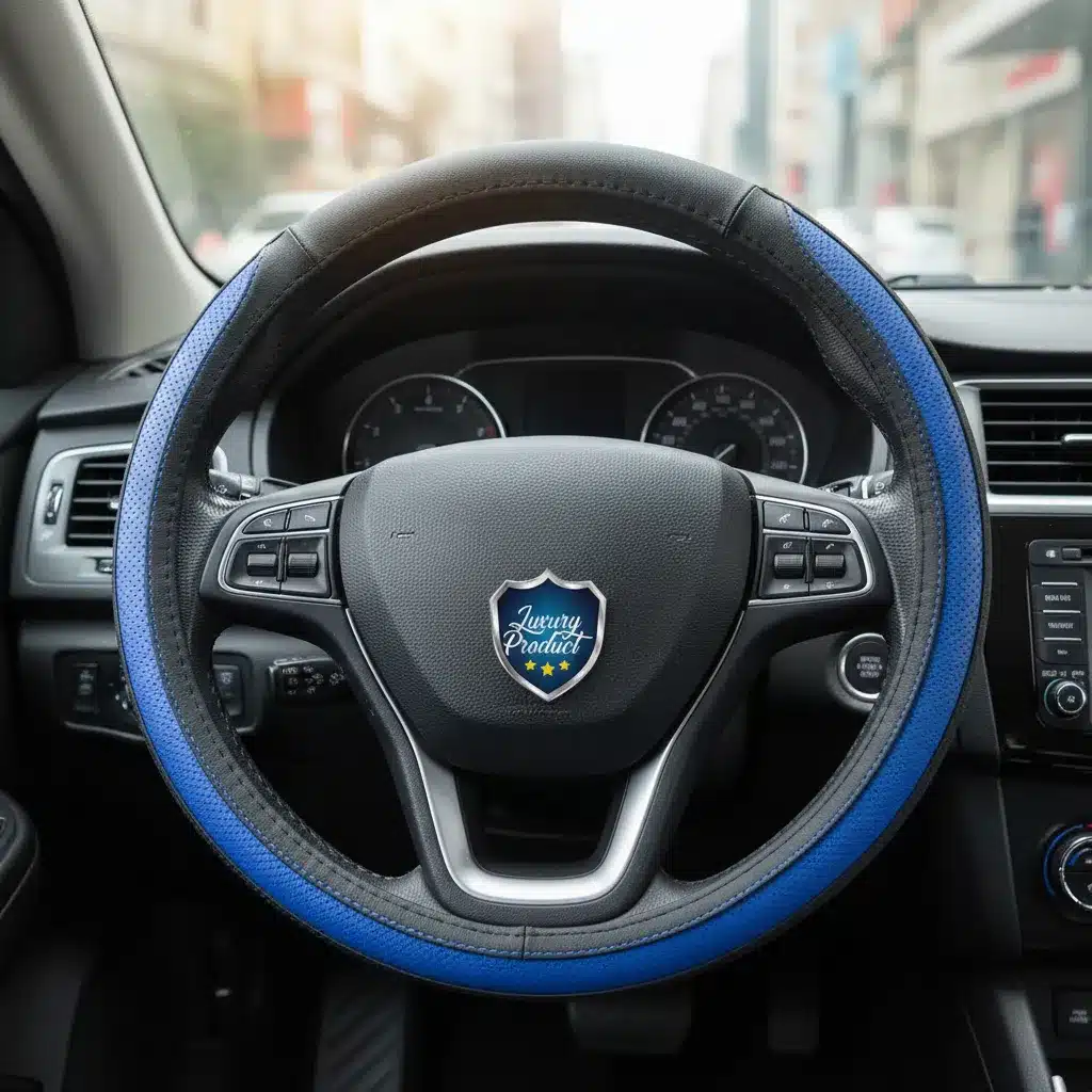 Fabricado en China con materiales de alta calidad, este accesorio no solo protege tu volante del desgaste diario, sino que también añade un toque de sofisticación a tu auto. La textura del cuero proporciona una sensación premium, mientras que su diseño en color negro con detalles en azul oscuro lo convierte en un elemento distintivo y atractivo.