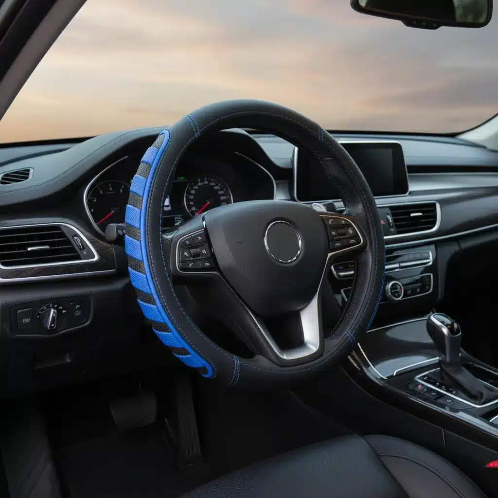 Fabricado en material PU-PVC, este cubre volante no solo ofrece una apariencia elegante, sino que también garantiza durabilidad y resistencia al desgaste. Su diseño en tonos negro y azul añade un toque moderno al interior de su vehículo, mejorando la estética general.