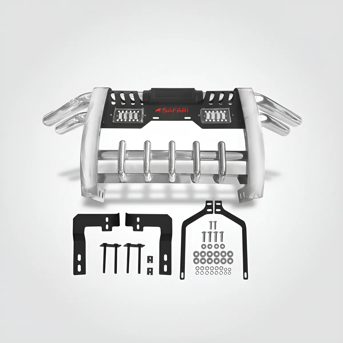 La Defensa Acero Inox Negro C/luz para Ford Ranger de 4ta Generación, marca Safari, es la solución ideal para quienes buscan robustez y estilo en su vehículo. Fabricada con acero inoxidable de alta calidad, esta defensa no solo proporciona una protección superior, sino que también añade un toque moderno y elegante a la estética de tu camioneta.