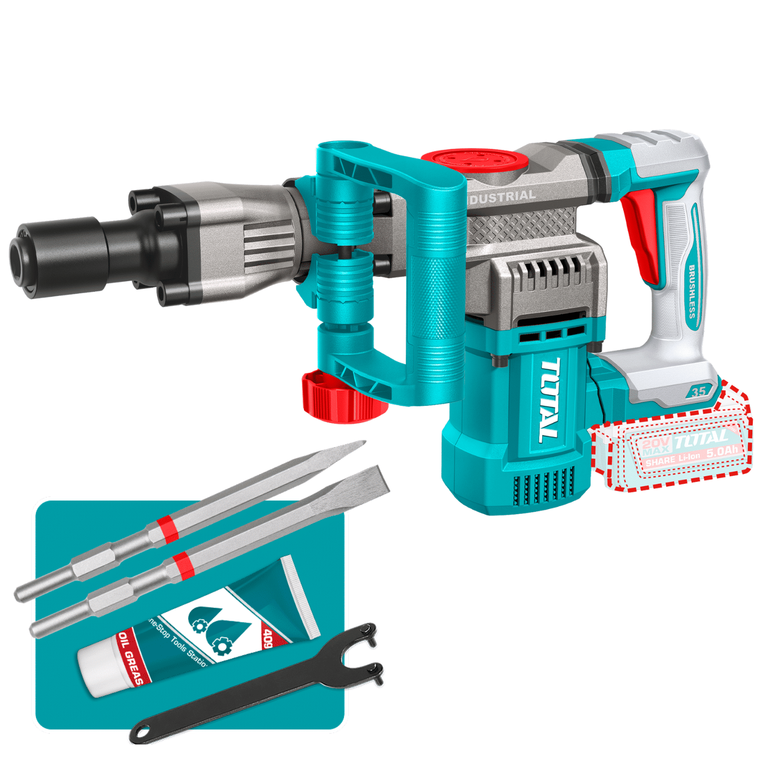 El Demoledor 20v Bl-motor 35mm Sds-hex 0-3200bpm 16j Industrial Turquesa de la marca Total es la herramienta ideal para profesionales que buscan potencia y eficiencia en sus proyectos de demolición. Con un voltaje de batería de 20V y una energía de impacto de 16 J, este martillo es capaz de enfrentar materiales duros como cemento, concreto y ladrillo con facilidad.