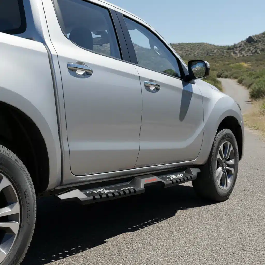 Su terminación mate no solo aporta un toque moderno, sino que también minimiza la visibilidad de rasguños y huellas, manteniendo su apariencia impecable. Diseñado específicamente para autos y camionetas, este estribo se adapta perfectamente a la estética del Mazda BT-50, mejorando su accesibilidad y facilitando el ingreso y salida del vehículo.