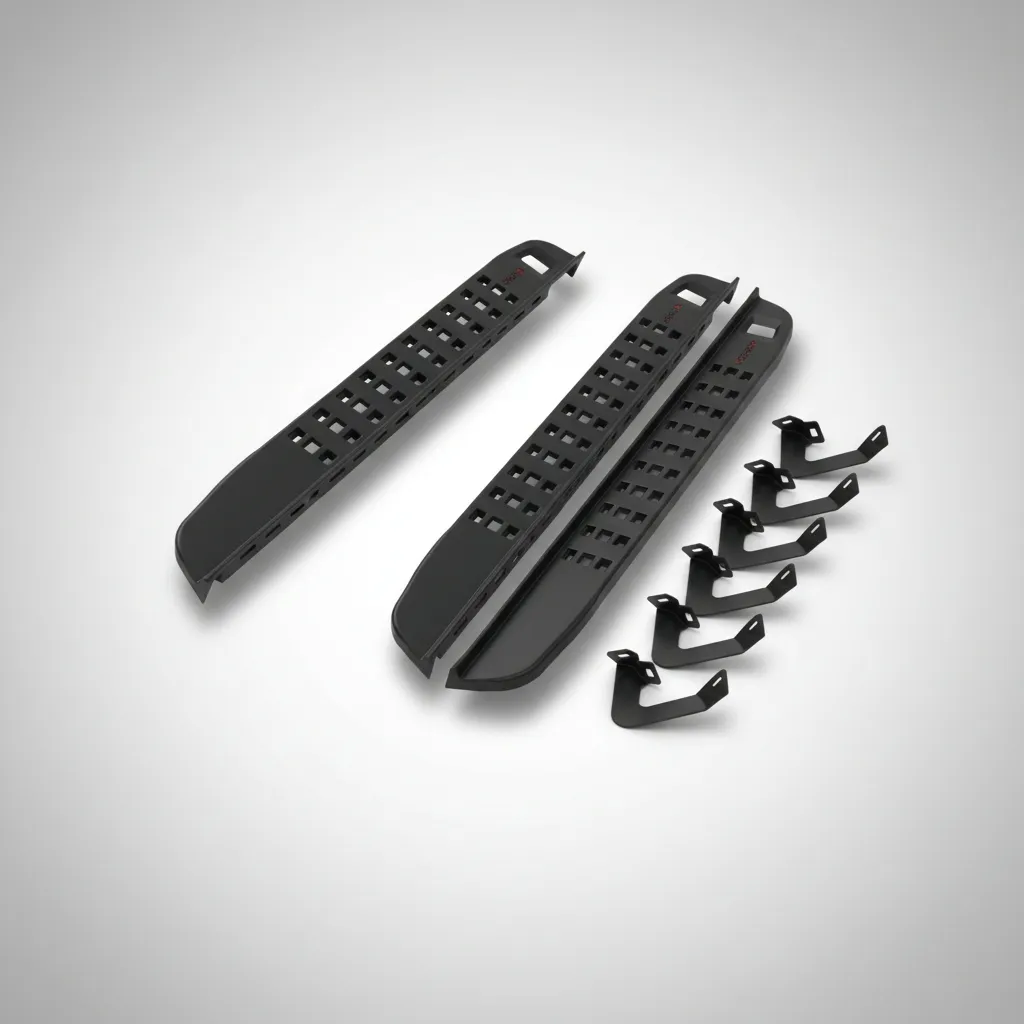 El Estribo S1 para Hilux Revo 8va Generación (2016 en adelante) de la marca Safari es la solución ideal para quienes buscan funcionalidad y estilo en su vehículo. Diseñado específicamente para colocarse en los laterales, este estribo ofrece una superficie de apoyo de 14 cm de ancho, garantizando comodidad y seguridad al entrar y salir del auto o camioneta.