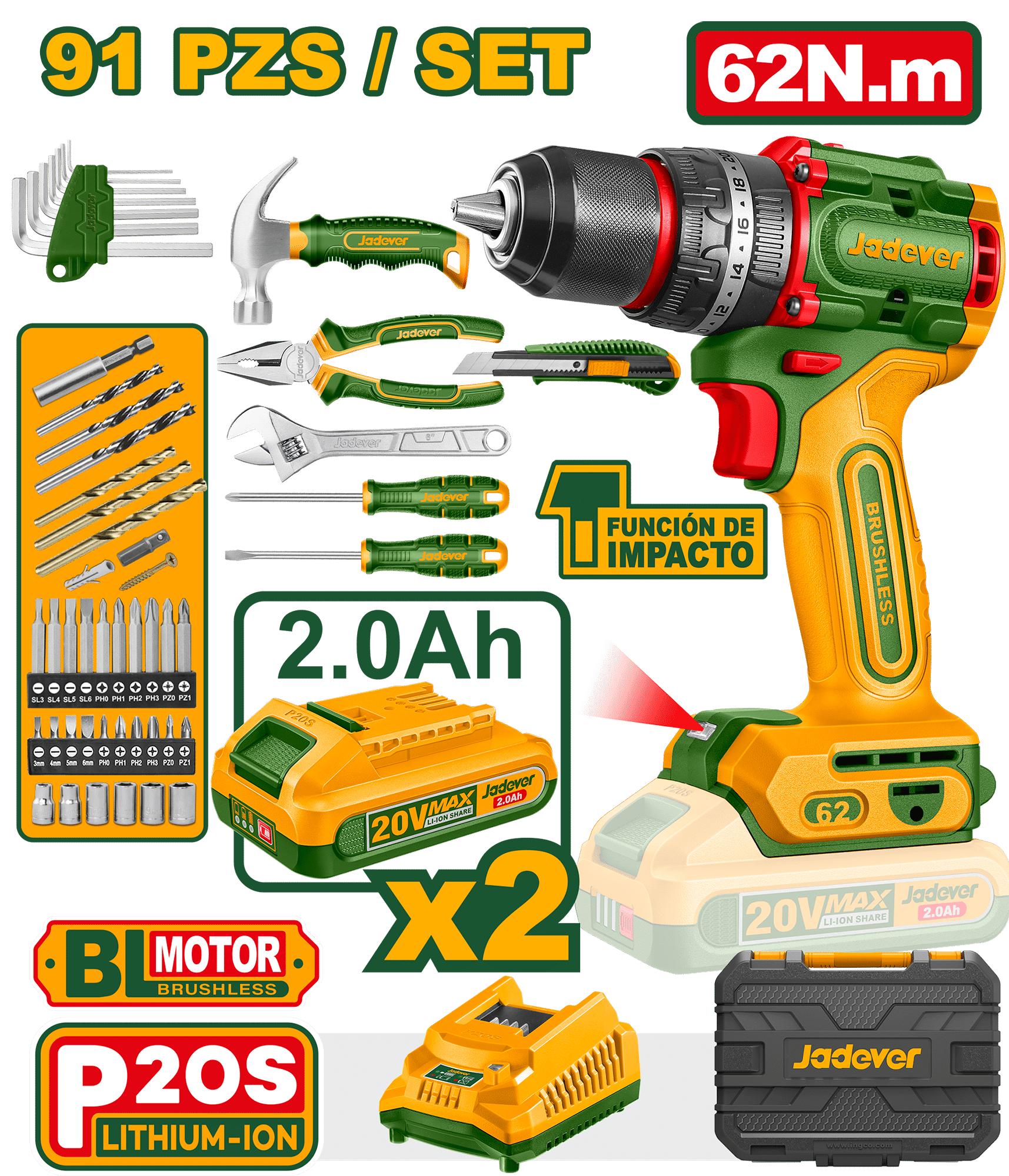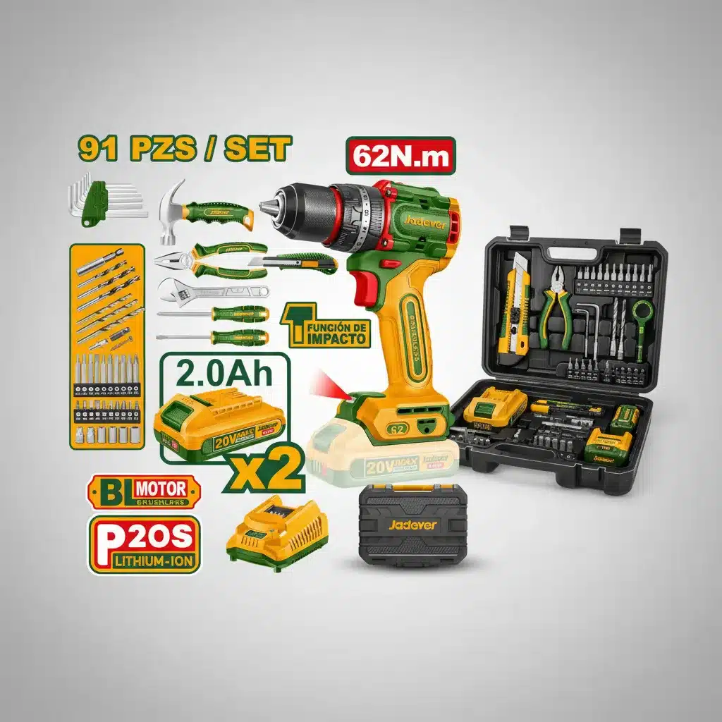 | Accesorio | Baterías 2×2.0Ah – Cargador 1.8A – 3 Brocas para concreto – 10 Puntas para destornillador cortas plano (3, 4, 5, 6 mm/ PH0, PH1, PH2, PH3, PZ0, PZ1) – 10 Puntas para destornillador largo (SL3, SL4, SL5, SL6, PH0, PH1, PH2, PH3, PZ0, PZ1) – 6 dados (5, 6, 7, 8, 9, 10) – Extensión de destornillador – 3 Brocas de punta brad – 3 Brocas de cobalto – Adaptador para dado – Tornillo con anclaje de plástico |