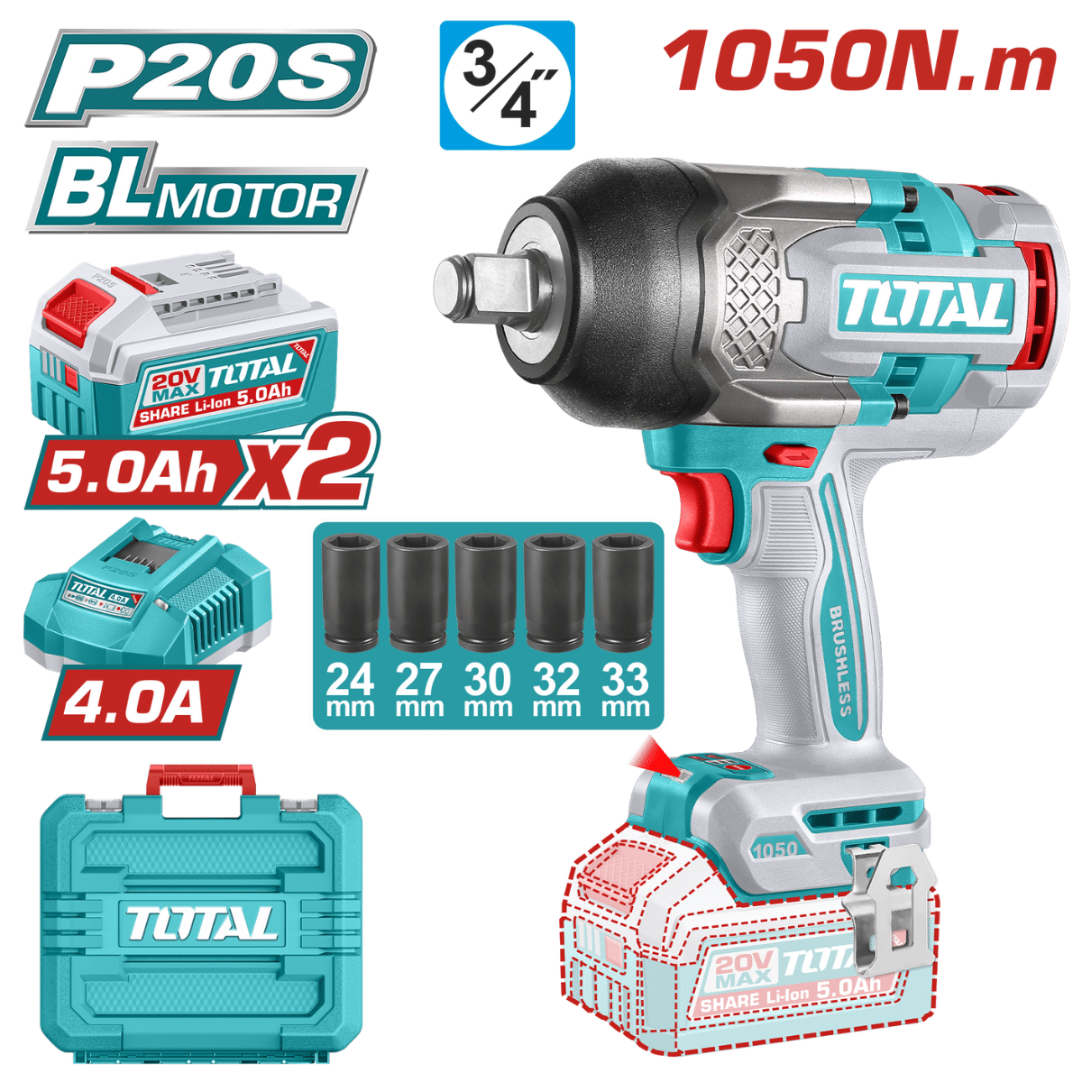 | Accesorio | 5 piezas de llaves de vaso profundas (24, 27, 30, 32, 33 mm) – 1 pieza de clip para cinturón – 2 piezas de batería de 5.0 Ah (TFBLI20531) – 1 pieza de cargador (TFCLI20411) |