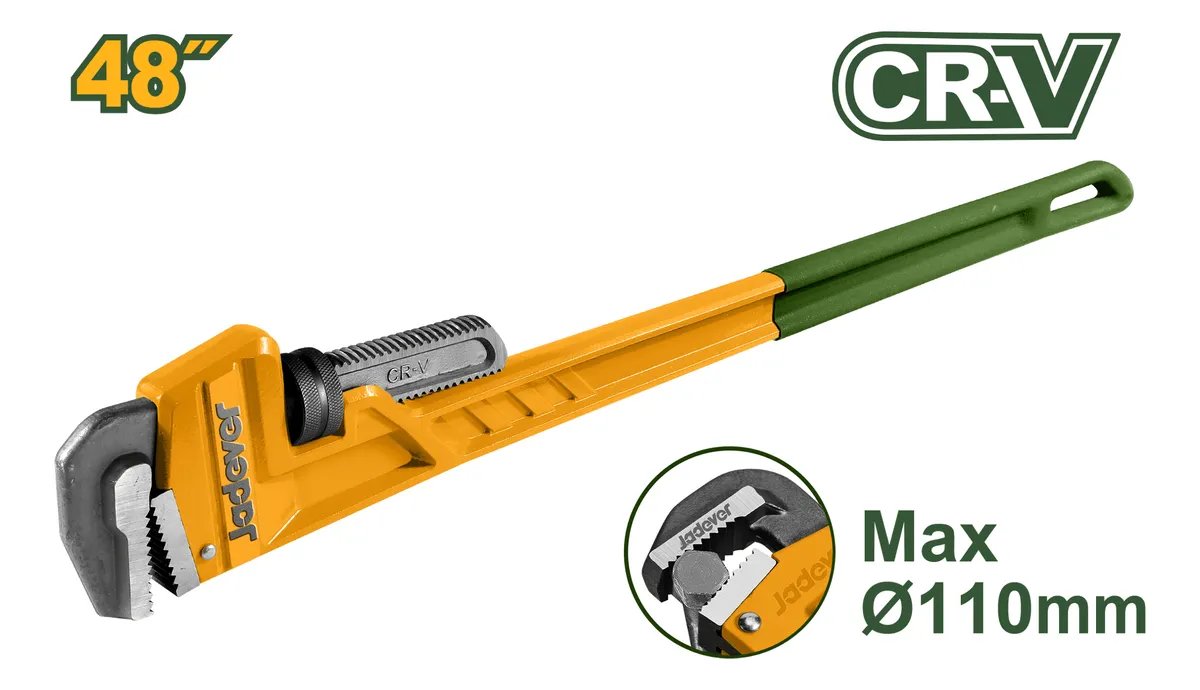 Llave Stilson de 48 pulgadas marca Jadever, fabricada en acero CR-V de alta resistencia. Ideal para trabajos de plomería y uso industrial, permite ajustar y aflojar tubos de hasta 110mm de diámetro máximo.