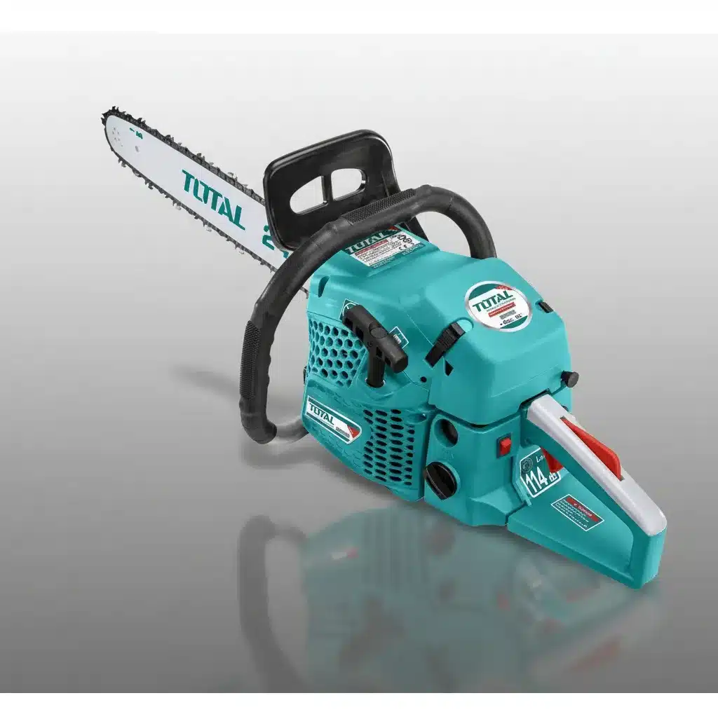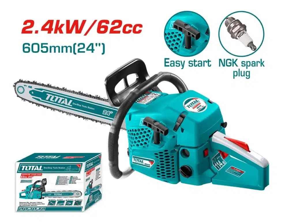 La motosierra Total TG5602411 es la herramienta ideal para quienes buscan potencia y eficiencia en sus trabajos de jardinería y tala. Con un motor de 62cc y 2.2 hp, esta motosierra ofrece un rendimiento excepcional, permitiendo realizar cortes precisos y rápidos en madera de diferentes densidades. Su espada de 24 pulgadas facilita el manejo en tareas que requieren mayor alcance, haciendo de cada corte una experiencia más fluida.