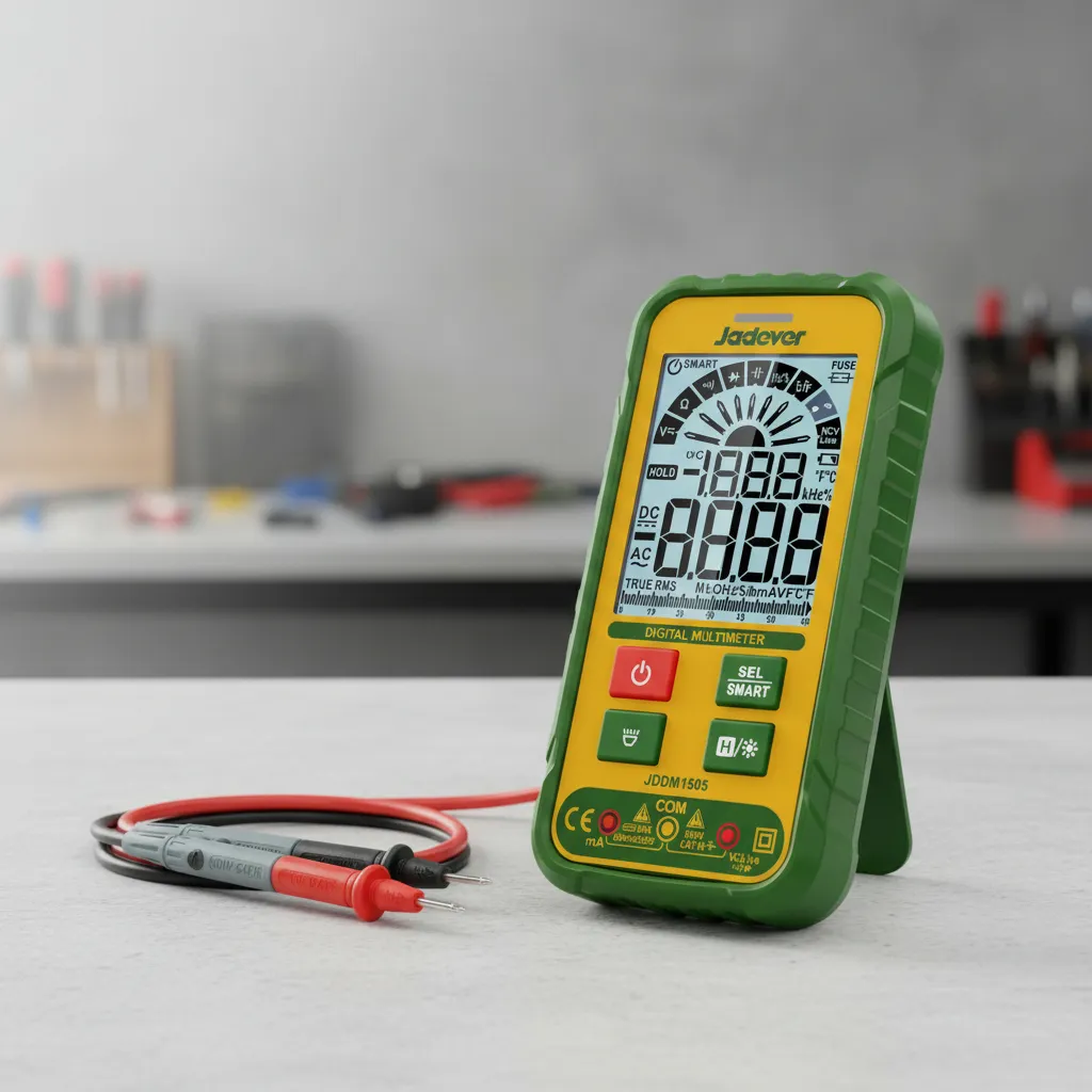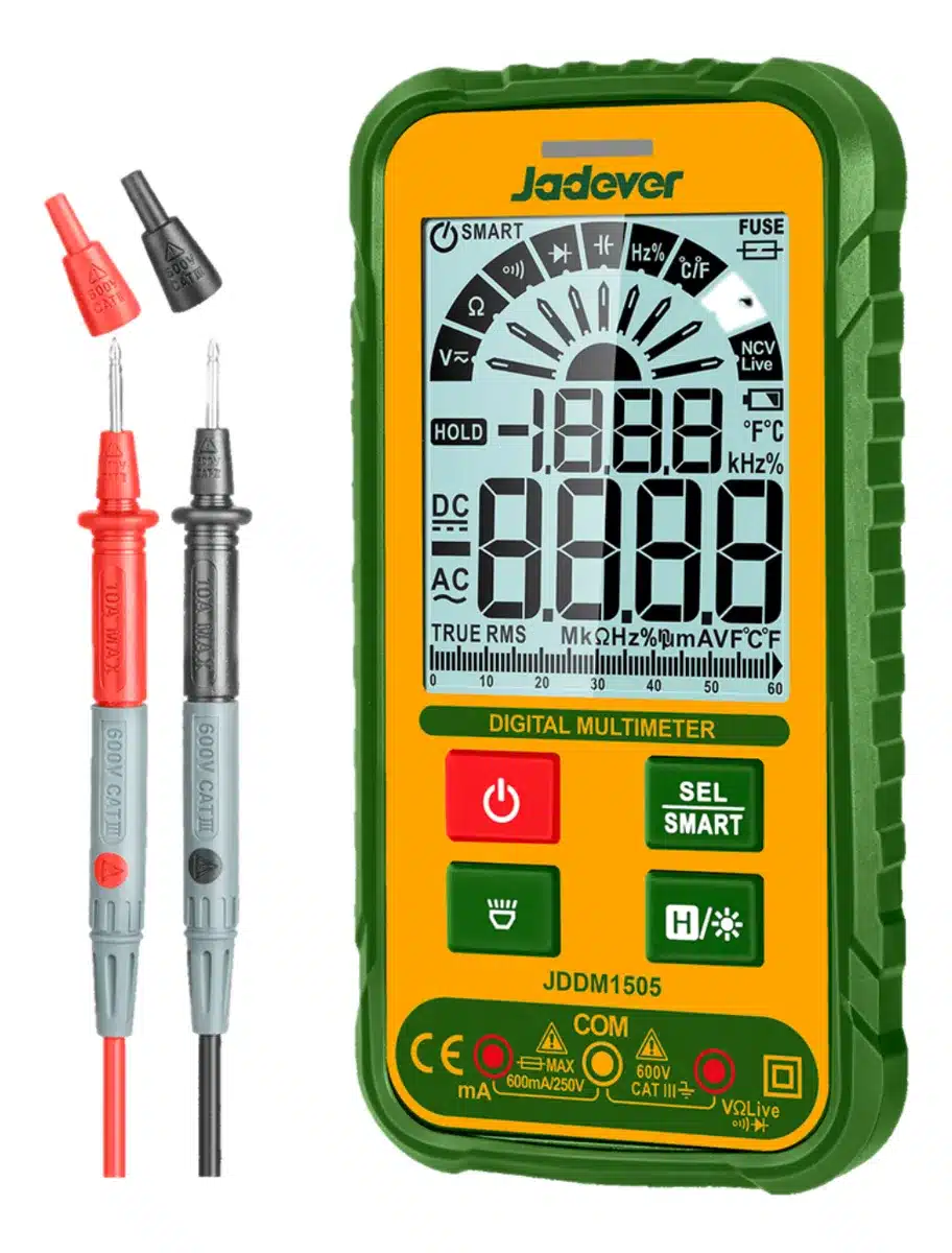 Multímetro digital de alta precisión ideal para profesionales y aficionados en electricidad y electrónica. Incluye puntas de prueba y baterías tipo moneda para un uso inmediato.