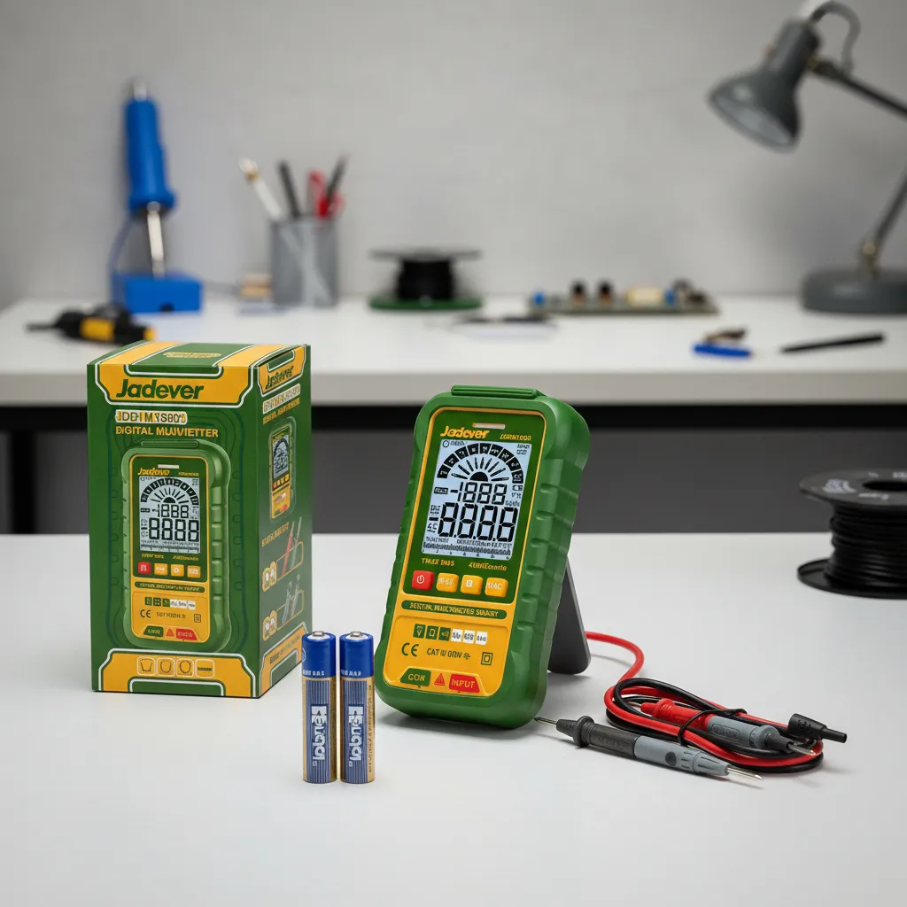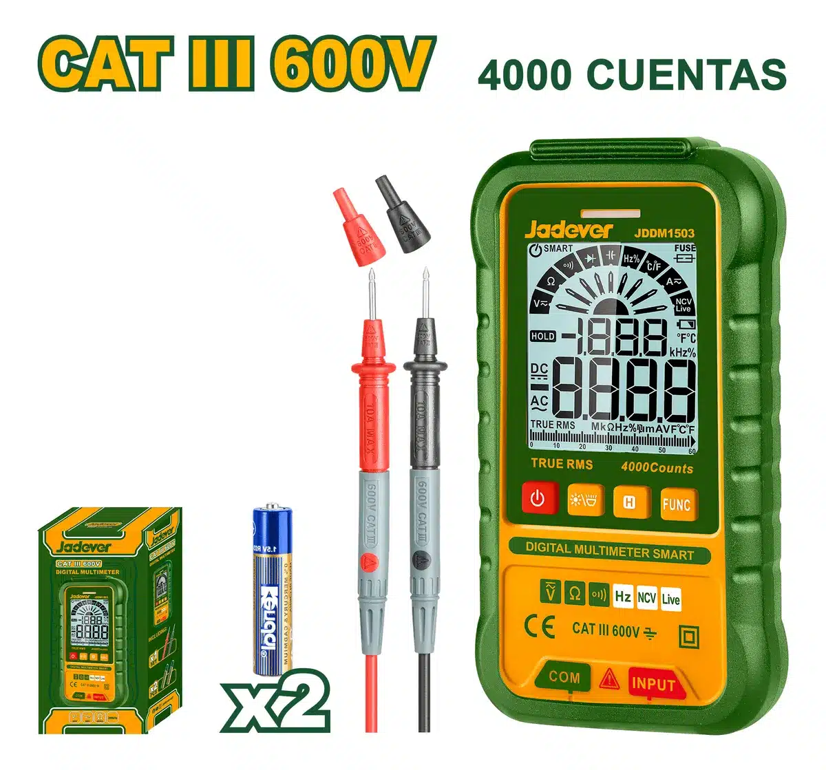 Multímetro digital de alta precisión ideal para profesionales y aficionados en electricidad y electrónica. Incluye cables de prueba y baterías para uso inmediato.