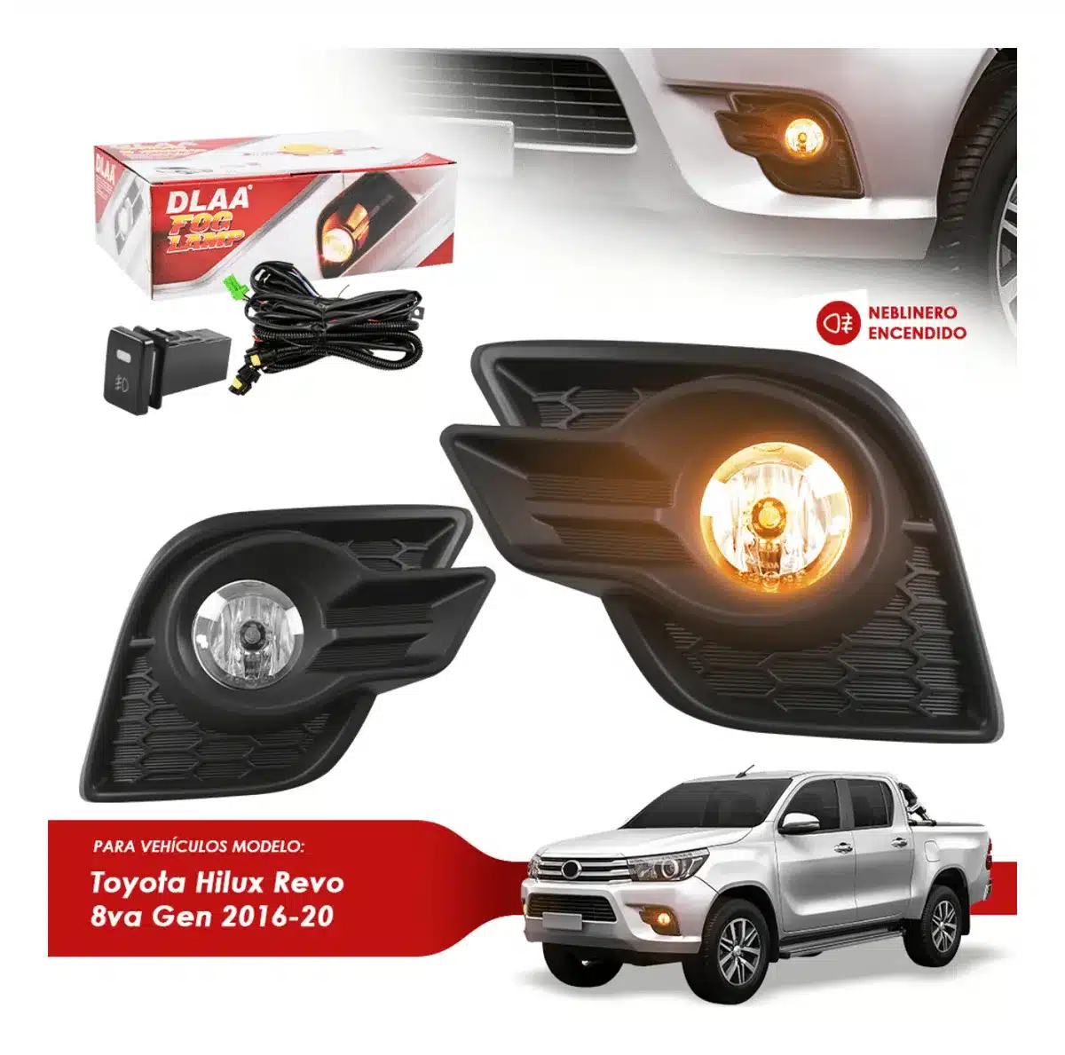 Mejora la visibilidad y seguridad de tu Toyota Hilux Revo 8va Gen 2016-2020 con el Set de Neblineros LED de Dlaa. Diseñados específicamente para este modelo, estos faros auxiliares ofrecen una iluminación potente y eficiente, ideal para condiciones de baja visibilidad. Su tecnología LED proporciona una luz clara y brillante, asegurando que puedas ver y ser visto en cualquier situación.