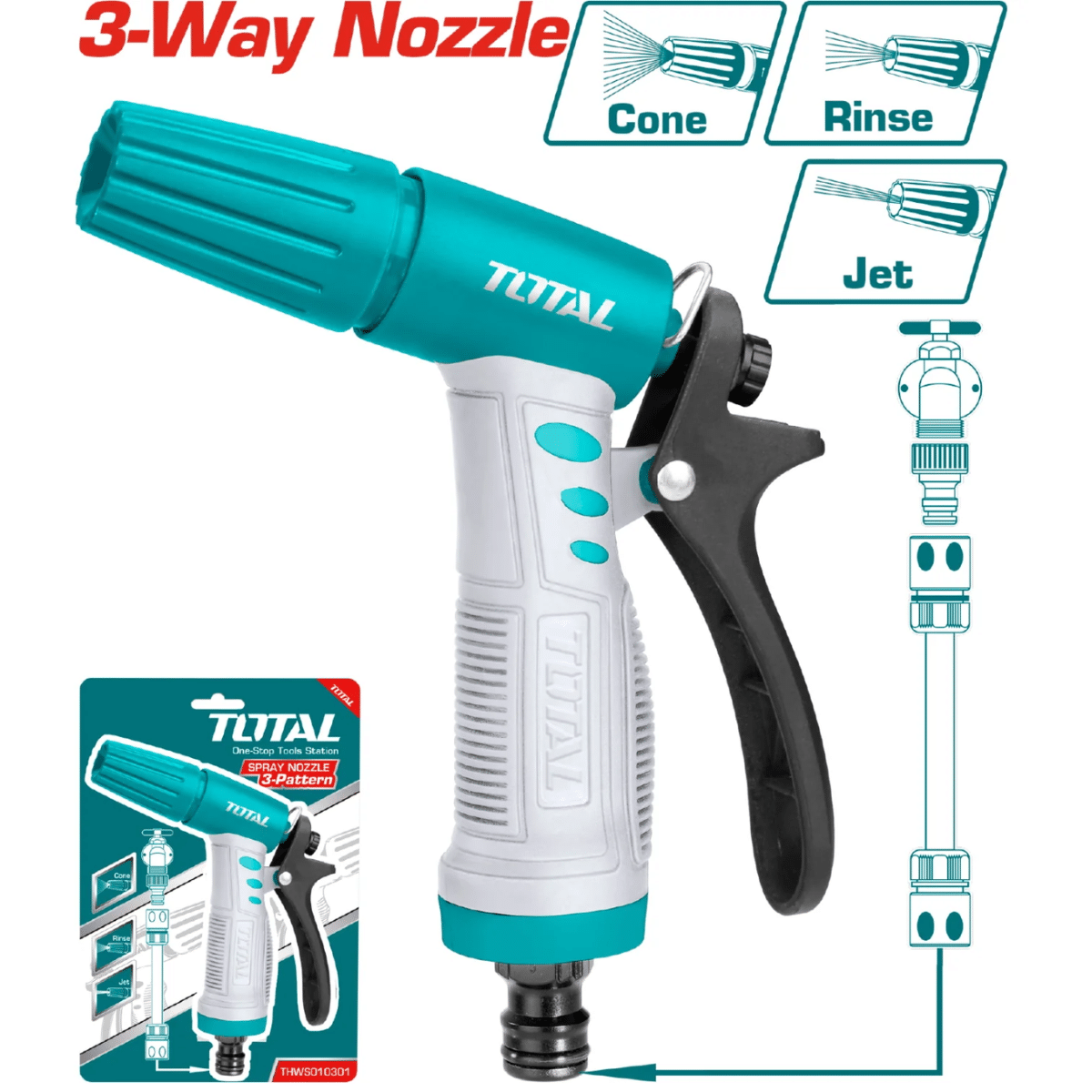 Pistola Boquilla de Agua de plástico Ajustable a 3 vias. Con conector rápido de 3/4''. Material de plástico ABS y resistente a alto impacto con TPR cómodo y suave agarre. Palanca de Nylon.