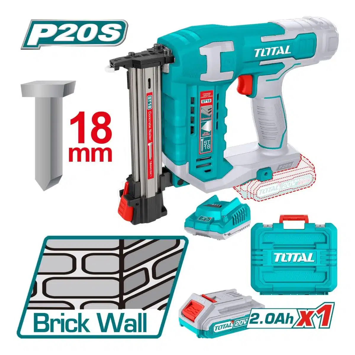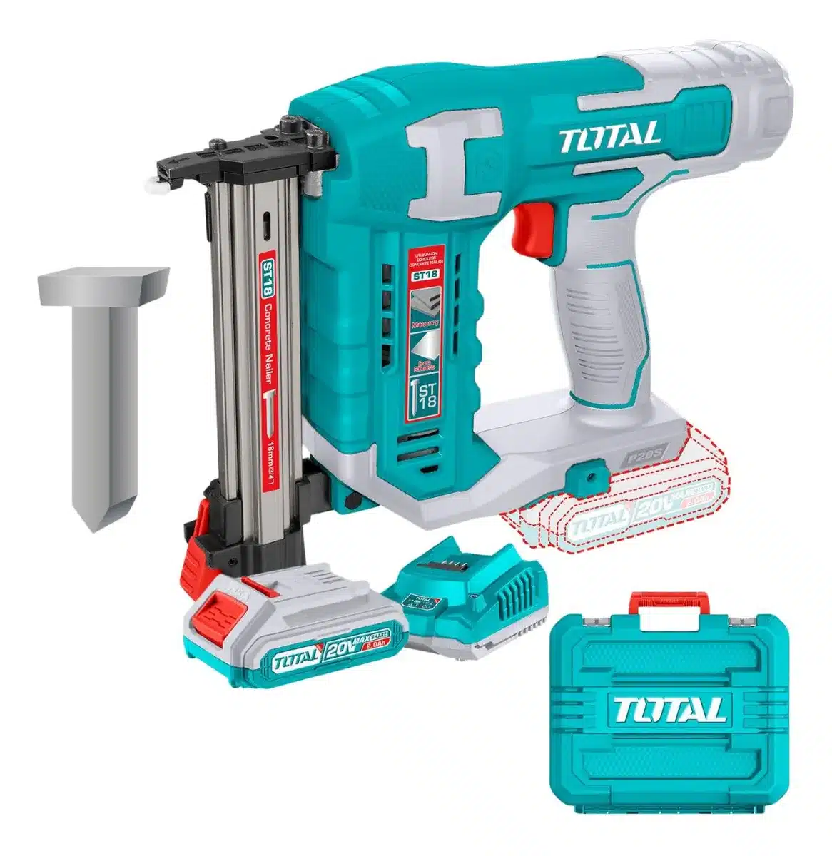Descubre la potencia y versatilidad de la Clavadora para Concreto Industrial + Batería 2ah + Cargador + 200 Clavos TOTAL. Ideal para fijar clavos en superficies duras como concreto y mampostería, este equipo es perfecto para proyectos de construcción y remodelación. Viene con 200 clavos y 2 accesorios esenciales para adaptarse a diversas tareas. Incluye batería y cargador para su uso inmediato. Su diseño inalámbrico te ofrece libertad de movimiento y facilidad de uso. Simplifica tus trabajos de fijación con esta herramienta eficiente y confiable.
