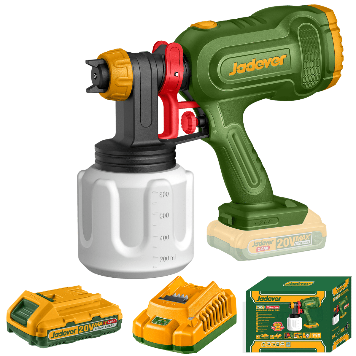 | Accesorios | 1 taza medidora de viscosidad – 1 Uds. Aguja de limpieza de boquillas – 1 paquete de baterías de 2, 0 Ah (JDLBP520) – 1 cargador (JDFCP502) |