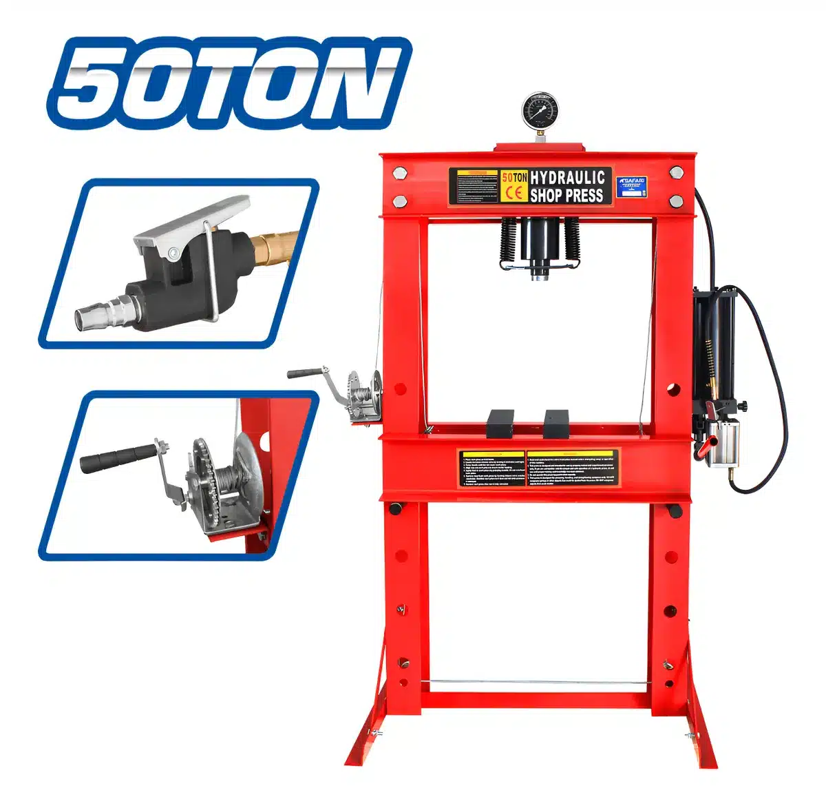 Con una capacidad de 50 toneladas, esta prensa permite realizar trabajos exigentes con facilidad, asegurando resultados precisos y de alta calidad. Su diseño ergonómico facilita el manejo y la operación, lo que se traduce en una experiencia de trabajo más cómoda y segura.