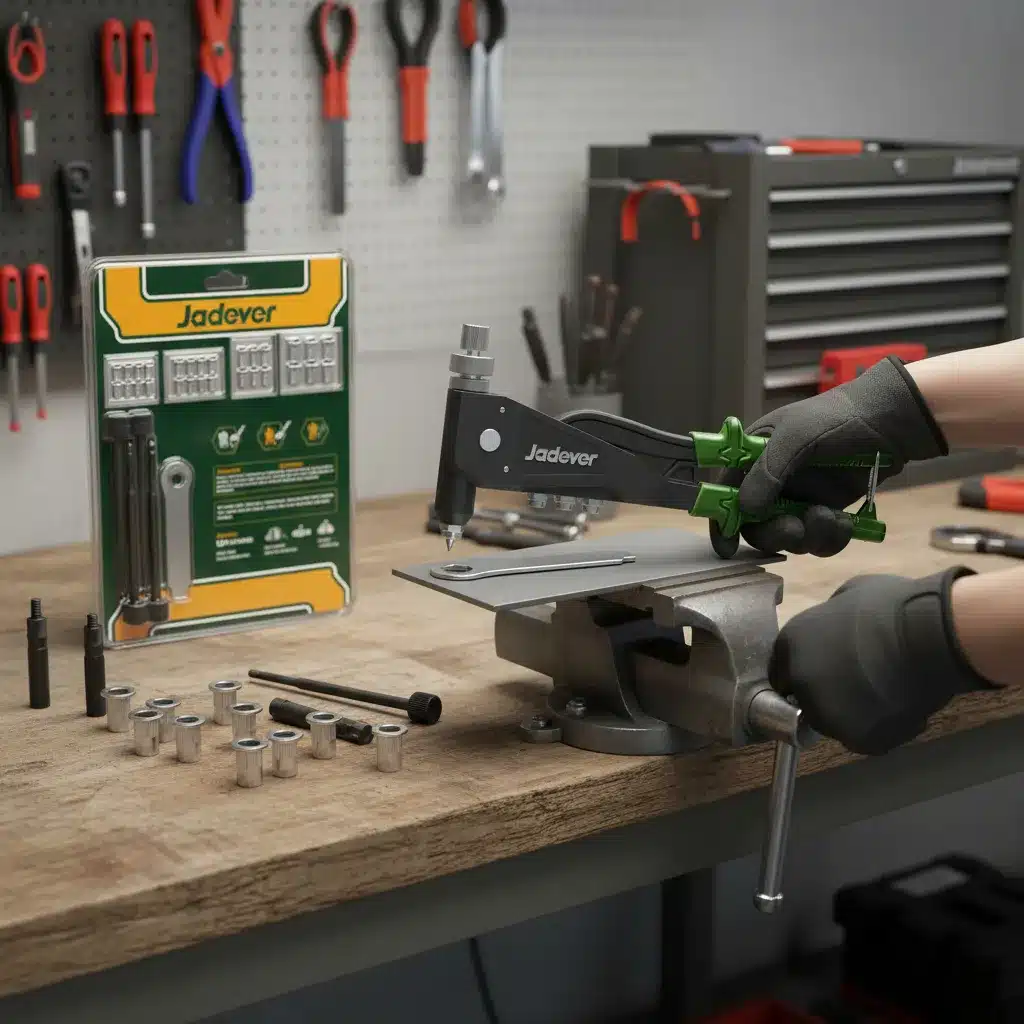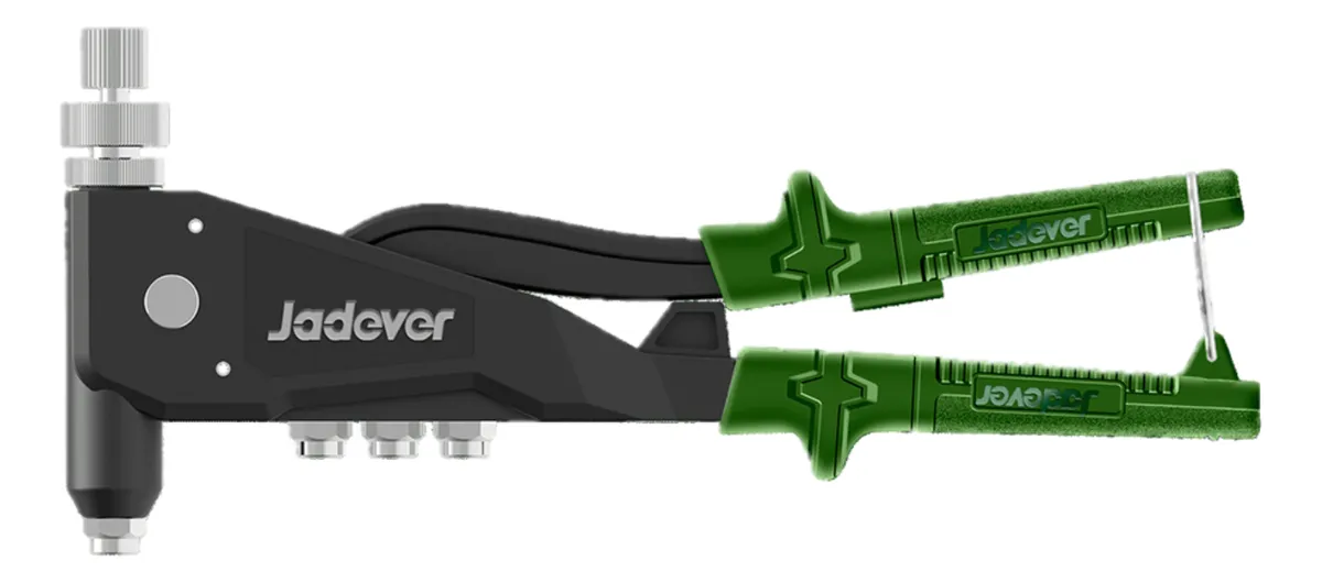 Remachadora manual Jadever de 10.5 pulgadas, compatible con remaches de tipo M3 a M6. Incluye 4 boquillas y 10 remaches para diferentes aplicaciones. Fabricada en material resistente, ideal para trabajos de ensamblaje y reparación.