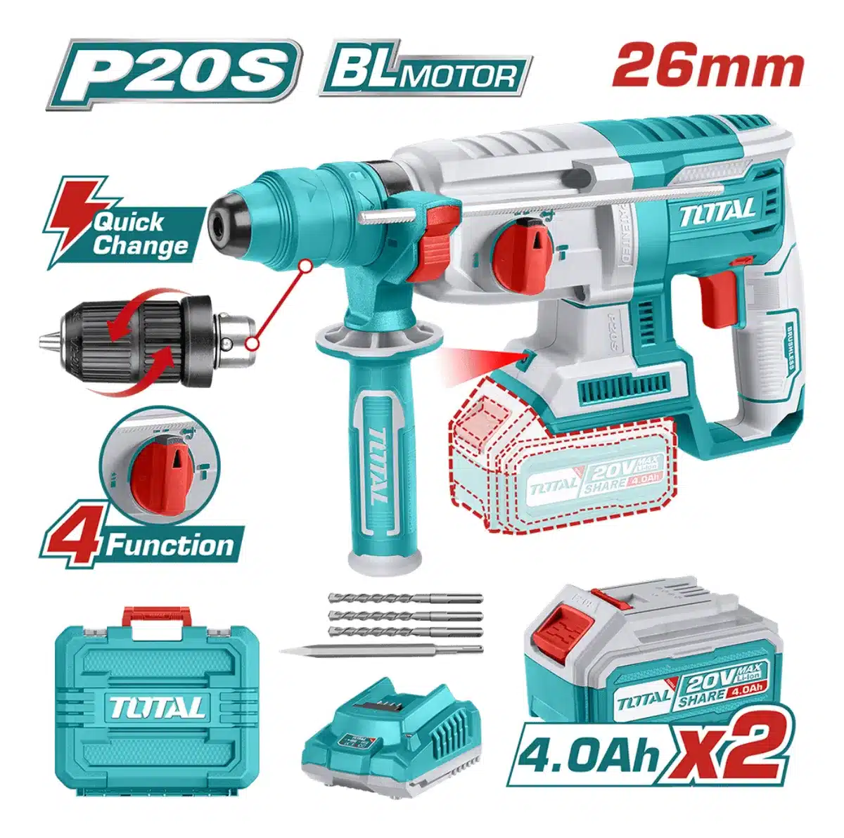 ROTOMARTILLO SDS+ 26MM 20V 2.5J 0-5000BPM BRUSHLESS 2X4.0AH 4FUNC INDUSTRIAL TOTAL – TRHLI202289