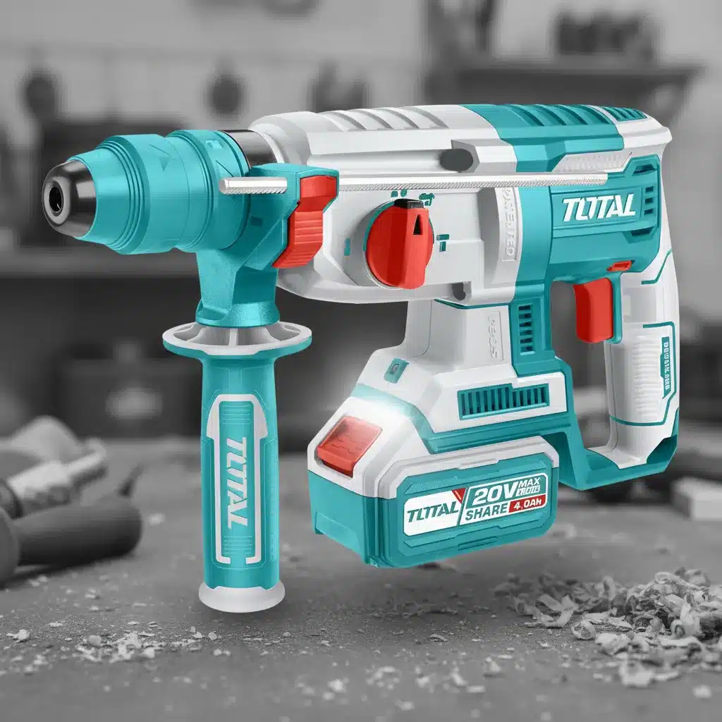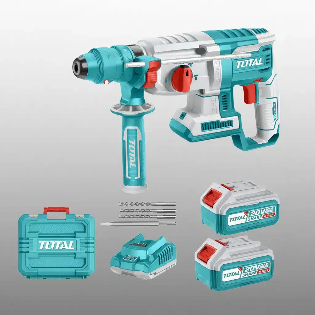 El Rotomartillo Electroneumático Total TRHLI202289 es la herramienta ideal para quienes buscan potencia y versatilidad en sus proyectos de construcción y remodelación. Con un diseño ergonómico en un atractivo color turquesa, este rotomartillo inalámbrico ofrece una velocidad máxima de rotación de 1100 rpm y un impresionante rendimiento de 5000 golpes por minuto, lo que lo convierte en un aliado perfecto para taladrar y cincelar.