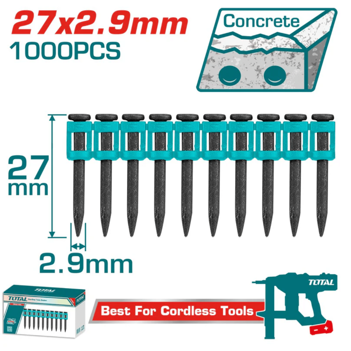 Características | Clavos para clavadora de concreto 27 mm 1000 unidades Compatible con: TCNLI9005, TCNLI9008, UTCNLI9008 |