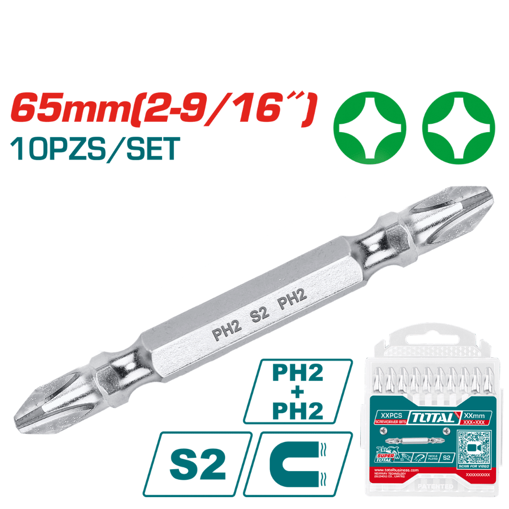 SET DE PUNTAS S2 (PH2+PH2) 65MM 10PCS/SET NIQUELADO MAGNETICO INDUSTRIAL - TAC16PH233