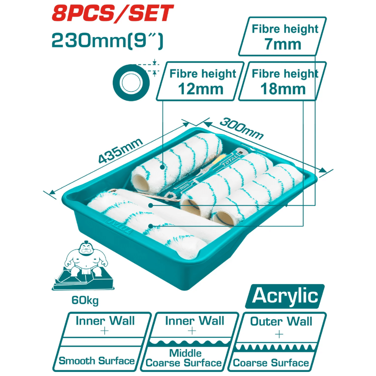 Juego de Rodillos para pintar 8 en 1 con bandeja de pintura. Para Interiores y Exteriores. 1 Rodillo 230 mm (9''). Espesor 7mm. 3 Rodillos 230 mm (9''). Espesor 12 mm. 1 Rodillo 230 mm (9''). Espesor 18 mm. 1 Rodillo 230 mm (9''). Espesor 7mm. 1 Soporte para Rodillos de 230 mm (9''). 1 Pincel de Diseño de 25 mm (1''). 1 Bandeja de 435 x 300 x 75 mm.