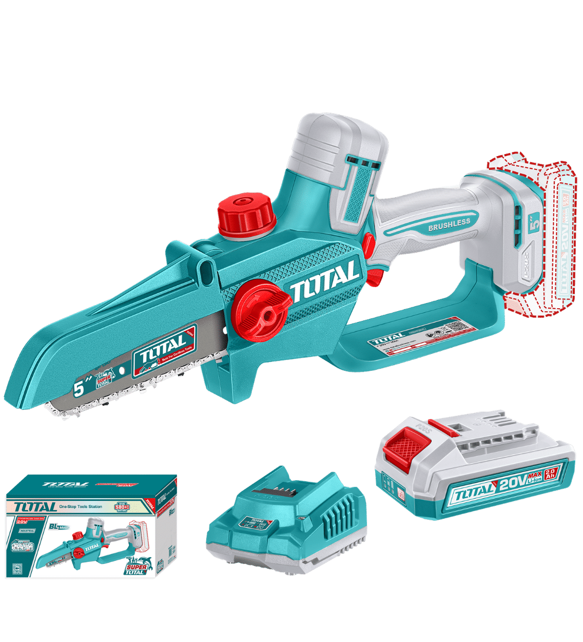 Accesorios 1 unidad de cadena de sierra de 5" – 1 unidad de barra de sierra de cadena de 5" – 1 unidad de llave – 1 unidad de batería de 2.0Ah (TFBLI20011) – 1 unidad de cargador (TFCLI2001)