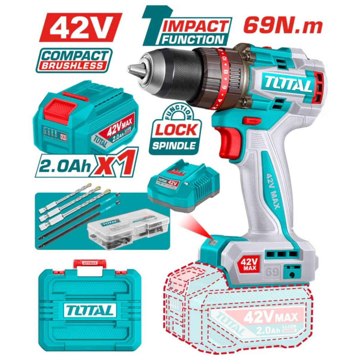 | *Nombre | Drill Taladro Inalámbrico 1/2” 42V Función de Impacto. Motor sin escobillas. 69Nm. |