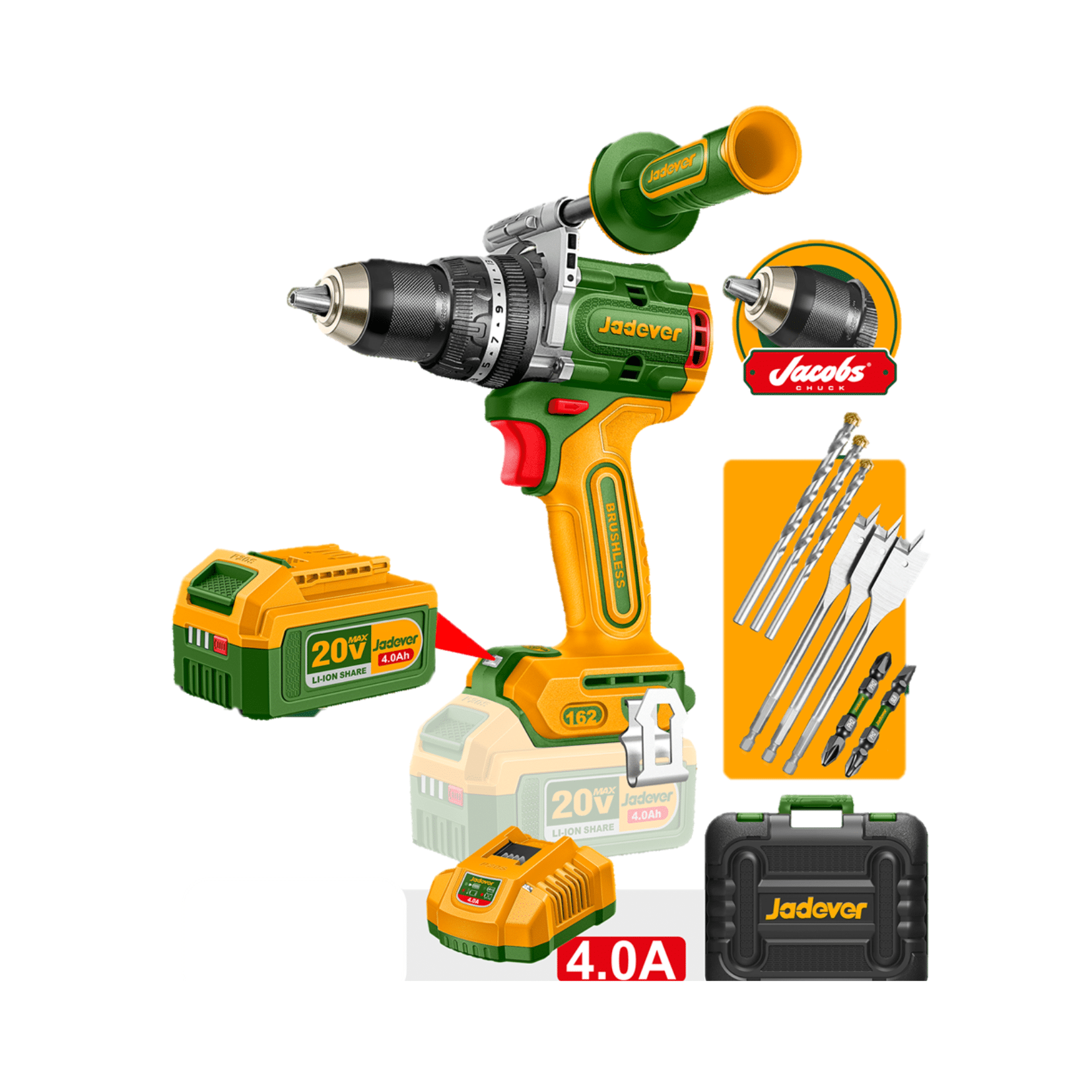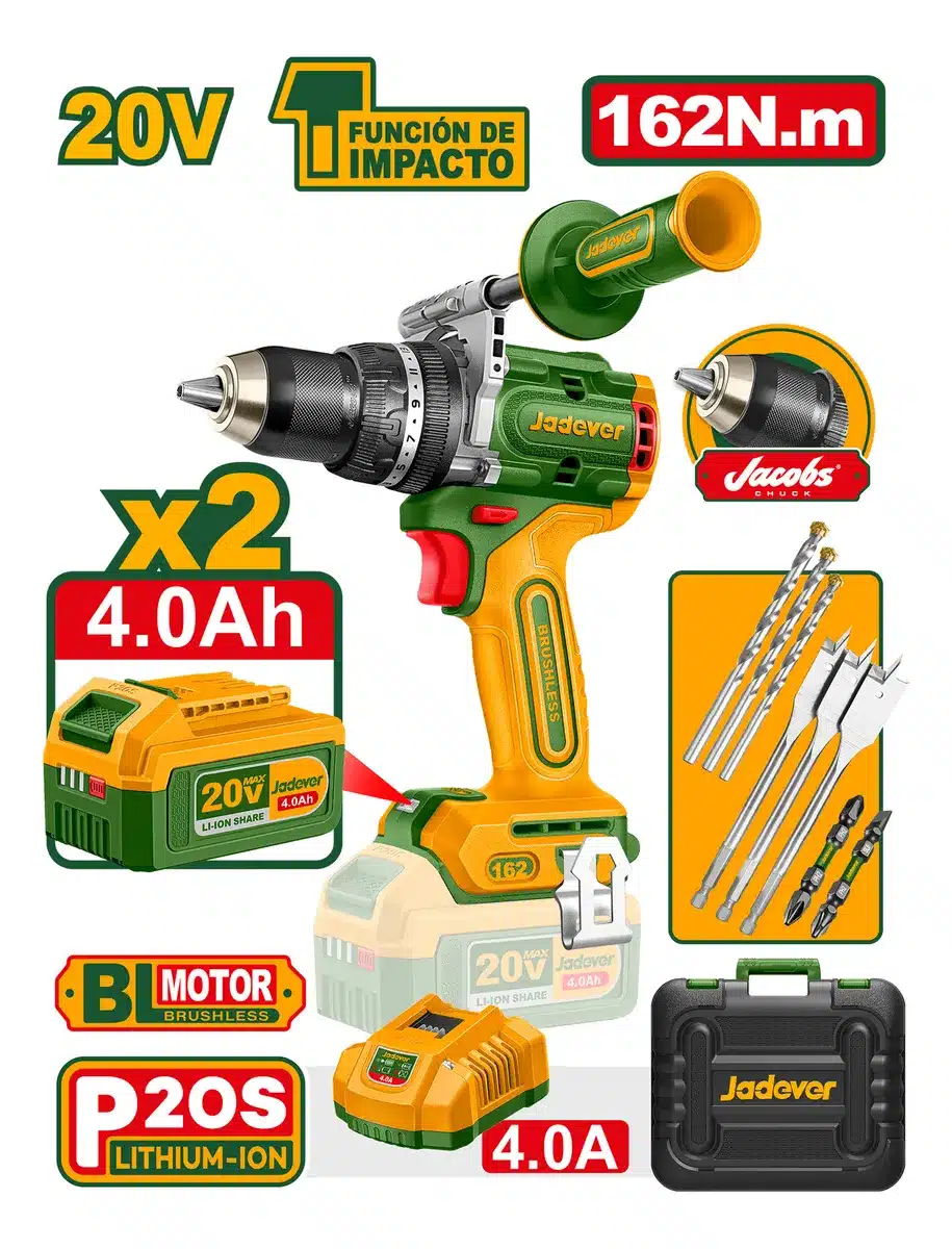 Accesorio 2 baterías 4.0 Ah (JDLBP540) – 1 cargador (JDFCP540) – 3 brocas planas para madera (16, 18, 20 mm) – 3 brocas para mampostería (5, 6, 8 mm) – 2 puntas para destornillador de impacto (PH2, SL6)